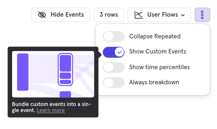 Flows identifies the most frequent paths taken by users to or from any event. Use Flows to understand how your users sequentially perform events in your product, and analyze drop-offs or unsuccessful behavior.